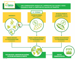 Le Cirad coordonne depuis 2025 le projet bana+, destiné à mettre au point, d’ici 2029, de nouvelles variétés de bananes capables de résister aux maladies fongiques comme la cercosporiose noire. L’objectif est double : réduire l’usage de pesticides et sécuriser l’avenir de la filière banane dans les départements d’Outre-mer.