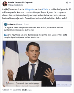 Sur le réseau social X le 14 octobre, l’élue mahoraise, Estelle Youssouffa, s’était félicitée du départ de Manuel Valls, qu’elle accuse d’avoir bloqué le dossier : « La reconstruction de Mayotte version Valls : 4 milliards promis, 25 millions payés. Son départ est une bénédiction : adios Valls ! ». L’arrivée de Naïma Moutchou pourrait donc marquer un tournant attendu : celui du passage des annonces aux actes.